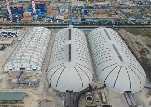 3#硫酸銨棚用途為存放散裝硫酸銨,采用三心圓柱面正三角型鋼管桁架結(jié)構(gòu),管桁架高度約為41.1,平面尺寸為長(zhǎng)240mX寬104m,主管桁架厚度為3.8m。下弦懸掛膜結(jié)構(gòu),膜結(jié)構(gòu)采用單層PVDF耐酸堿環(huán)境膜材,此舉有效解決了具有弱酸性強(qiáng)腐蝕性硫酸銨對(duì)建筑主體鋼結(jié)構(gòu)的腐蝕問(wèn)題,在沿海地區(qū)存放散裝硫酸銨的管桁架反吊膜罩棚為目前全國(guó)首創(chuàng)。