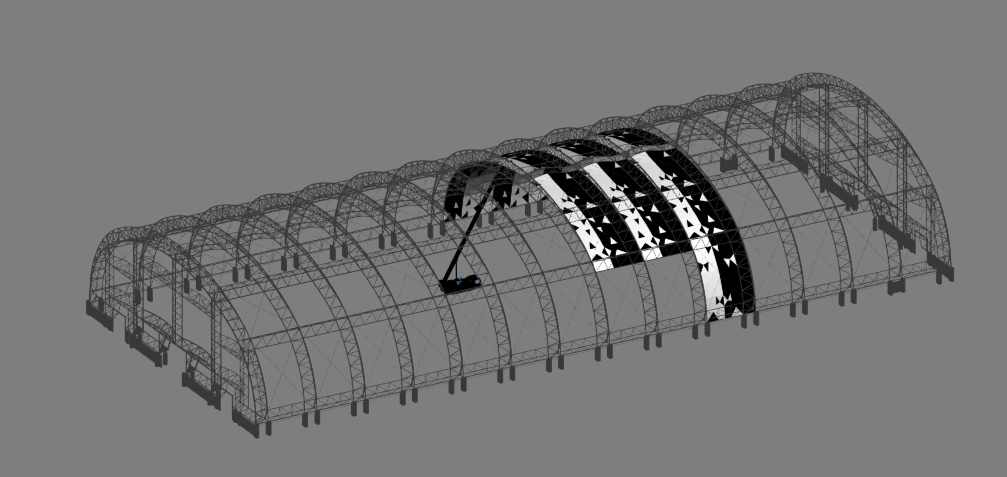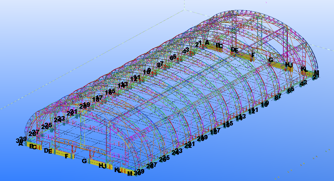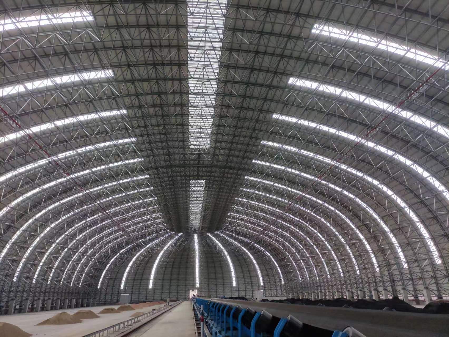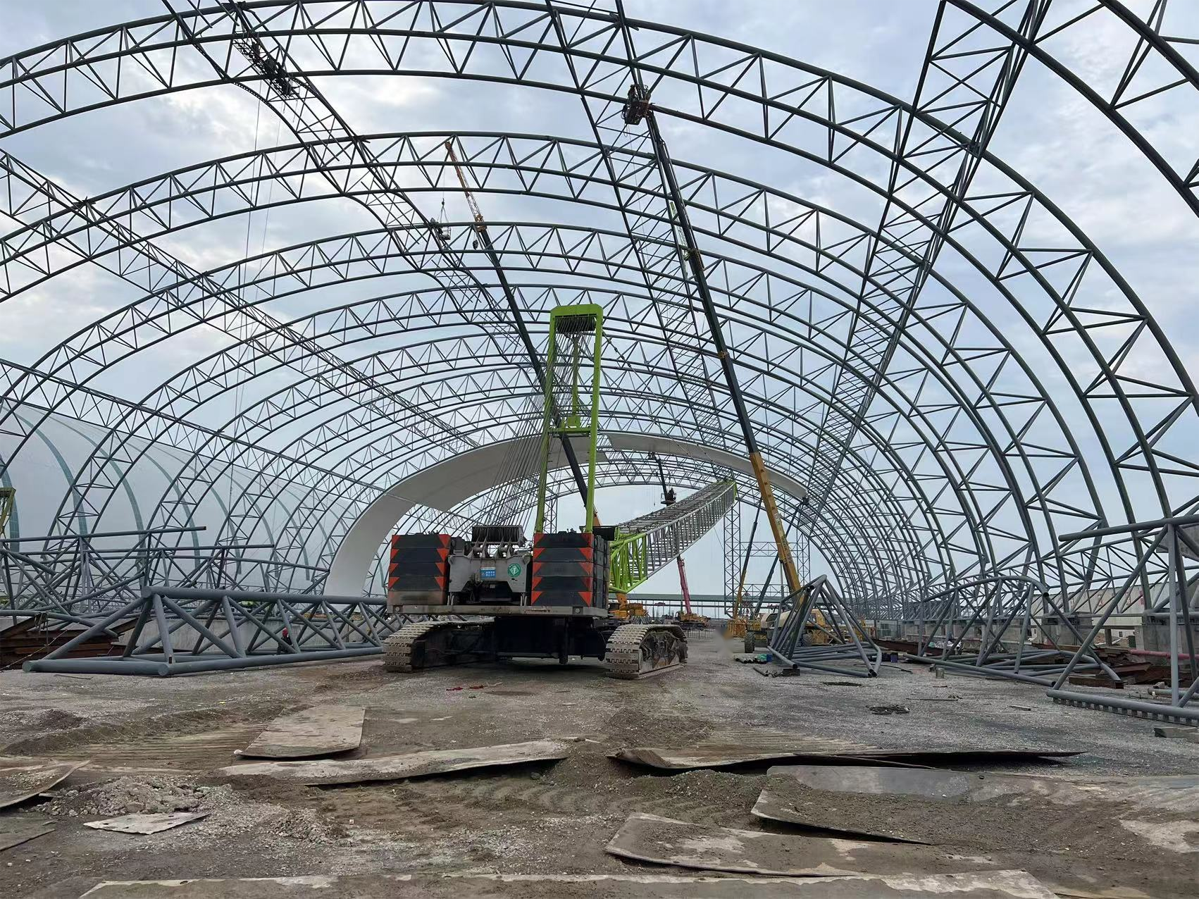 1#干煤棚結(jié)構(gòu)為大跨度三心圓筒殼鋼網(wǎng)架結(jié)構(gòu),山墻為圓弧形(子彈頭)落地山墻,采用正放四角錐弧形面螺栓球節(jié)點(diǎn)結(jié)構(gòu),網(wǎng)架長(zhǎng)度為330m,寬(跨)度為119m,結(jié)構(gòu)頂標(biāo)高為42.9m,網(wǎng)架厚度為4.4m,網(wǎng)格為4.5m*4.5m,桿件最大截面尺寸為Φ325*20,最大桿件高強(qiáng)螺栓直徑M85,最大螺栓球規(guī)格Φ380,最大焊接球規(guī)格WSR6030,干煤棚跨度為目前福建省內(nèi)最大。
